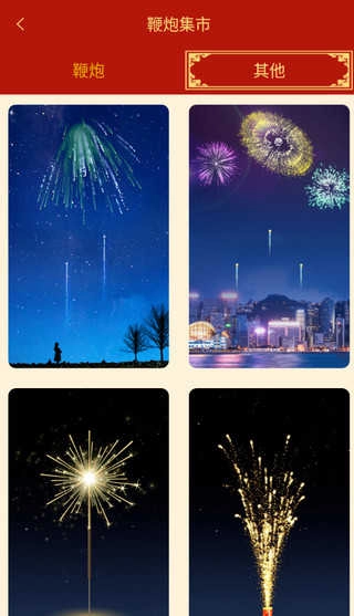 3、中间的功能按钮可以进入“烟花爆竹集市”,这里汇集了各种各样的虚拟烟花种类,所有都是免费开放的,不需要内购,能够尽情游玩没有顾虑!等下我会带着你逐个进行探索。