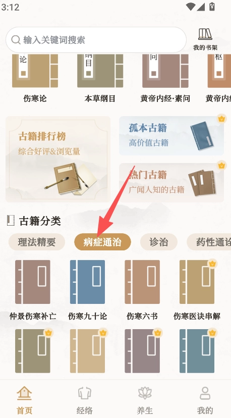 2、分类导航清晰直观,病症通治等分类板块设置明确,点击即可进入对应的古籍分类页面,操作简单便捷,有助于提升学习效率。