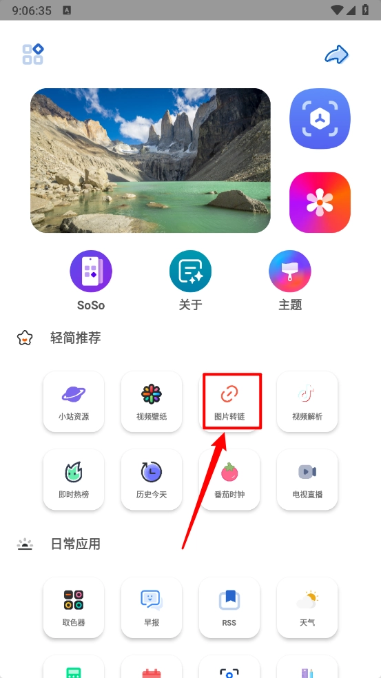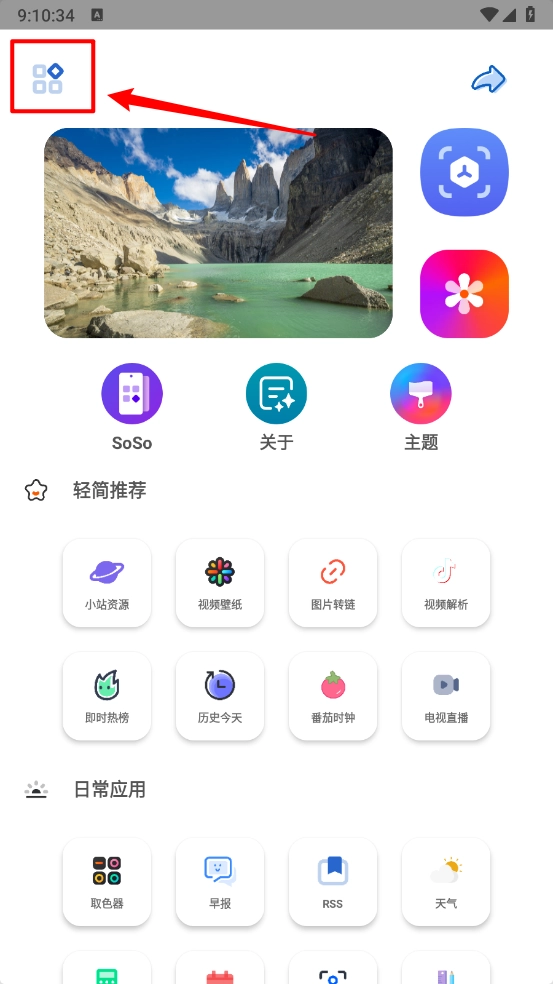 1、打开轻简工具,进入主页点击左上角图标,如图。