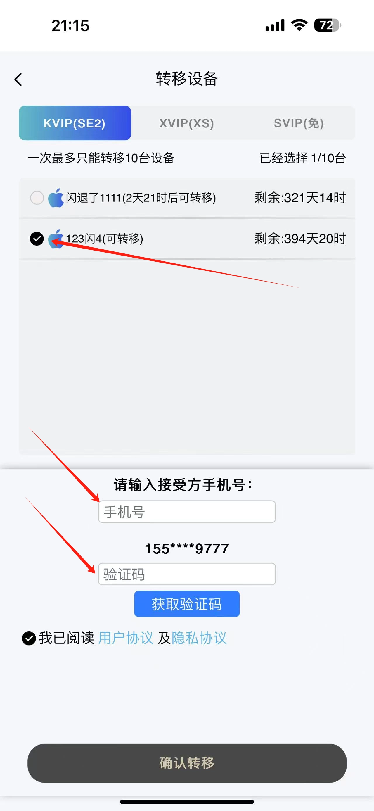 3、勾选需要转移的设备,填写手机号,获取验证码,阅读并确认协议后完成转移操作即可。