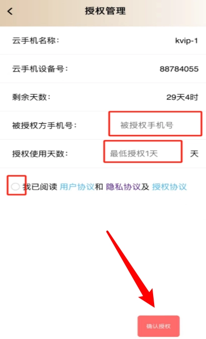 3、进入后填写对方的手机号码、授权使用时长,勾选用户协议与隐私政策,点击右下角的“确认授权”按钮就可以了。