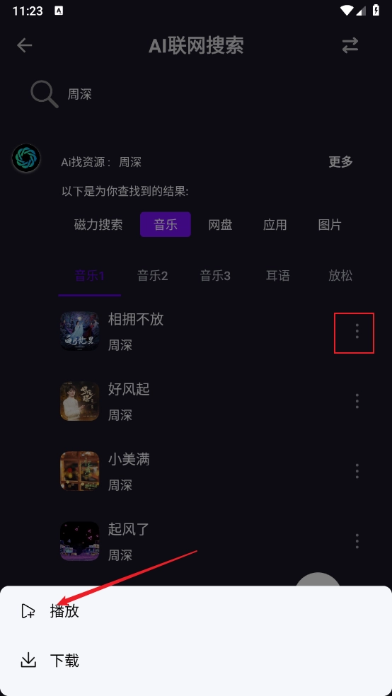 4、接着点击歌曲右侧的三个点,弹出弹窗后,点击“播放”按钮即可。