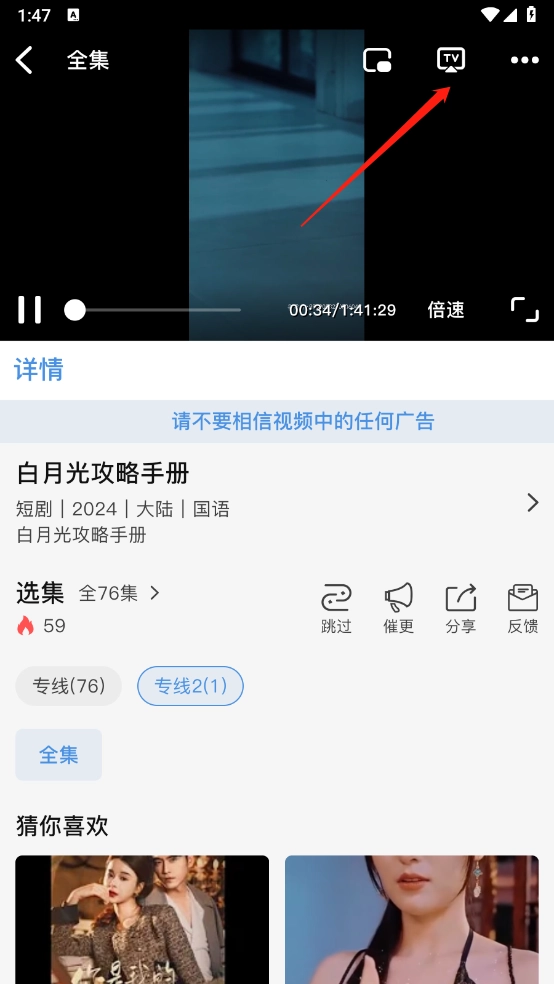 2、点击进入正片,点击右上角的“TV”标志。