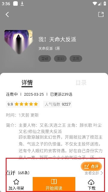 3、点击作品封面进入详情页,如图所示,在这里可以进行点评、加入书架等操作。