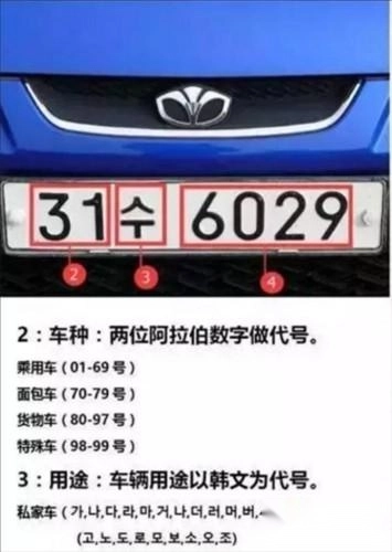 韩国的车牌与日本的颇为相似,私家车相比商用车会少显示一项用途相关的信息,其中私家车车牌为白底黑字,商用车车牌则是黄底黑字。