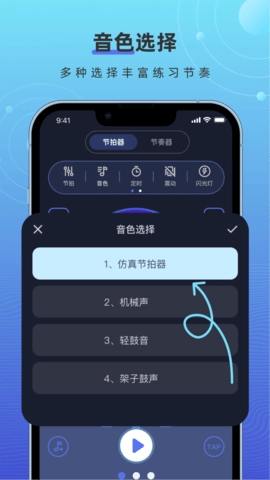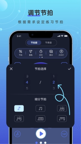 手机打碟节拍器不仅能帮你培养节奏感,还有不少实用功能。它具备自动调音功能,能让你的音准更精准。不管是演奏乐器还是唱歌,音准都至关重要,这款节拍器可以辅助你校准音准,让音乐更动听。同时它也支持手动调音,方便你根据自身需求调整。无论需要细微调整还是较大幅度的改动,这款节拍器都能满足你的要求。