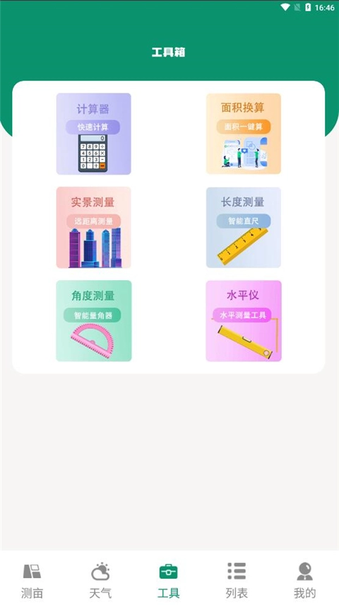 在工具板块中,还包含了***、面积换算、长度测量、实景测量、角度测量以及水平仪等功能。