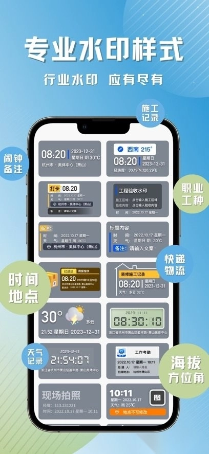 可自定义水印样式,能记录时间、地点、经纬度、海拔、方位角度、地理位置、天气、工程信息以及自定义备注等内容。