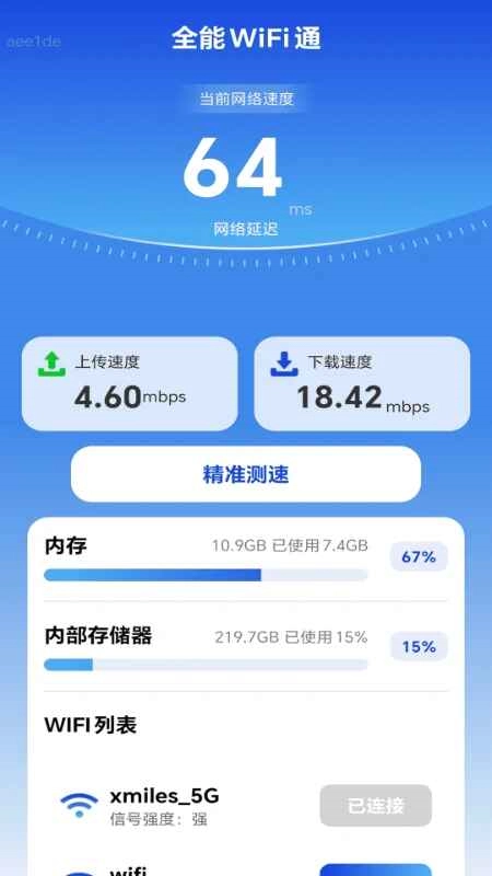 4.一键测速:可快速检测网络速度,协助用户判断当前WiFi是否能满足日常上网所需。