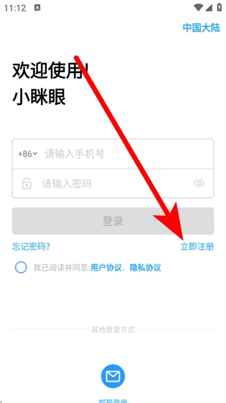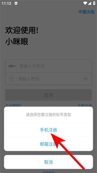 1、启动小眯眼应用,在欢迎使用的页面中,点击“立即注册”按钮,随即进入注册选择的弹窗界面。