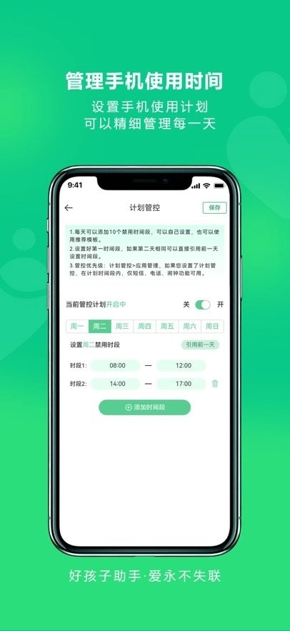 1. 时间管控:家长能够为孩子使用手机与平板设定具体的使用时段和时长,时间一到设备会自动锁屏,这样能有效避免孩子过度沉迷。