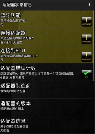 4、在适配器状态界面,用户能够查看蓝牙、适配器、ecu等设备的连接状态及相关信息。