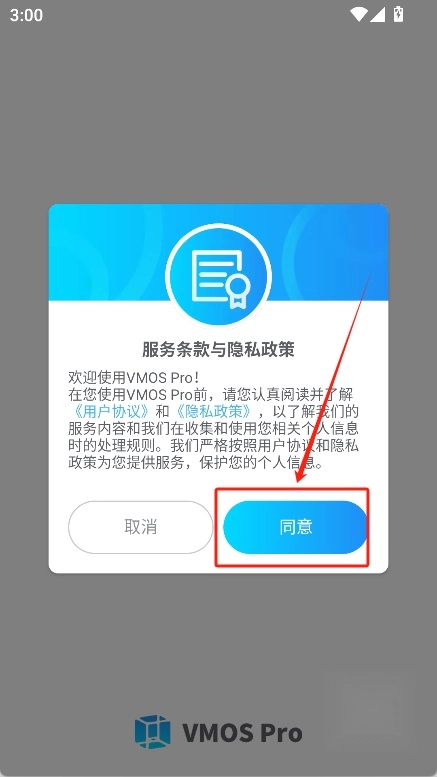 1、第一步先下载并安装VMOS Pro,进入软件时选择“同意”按钮即可进入