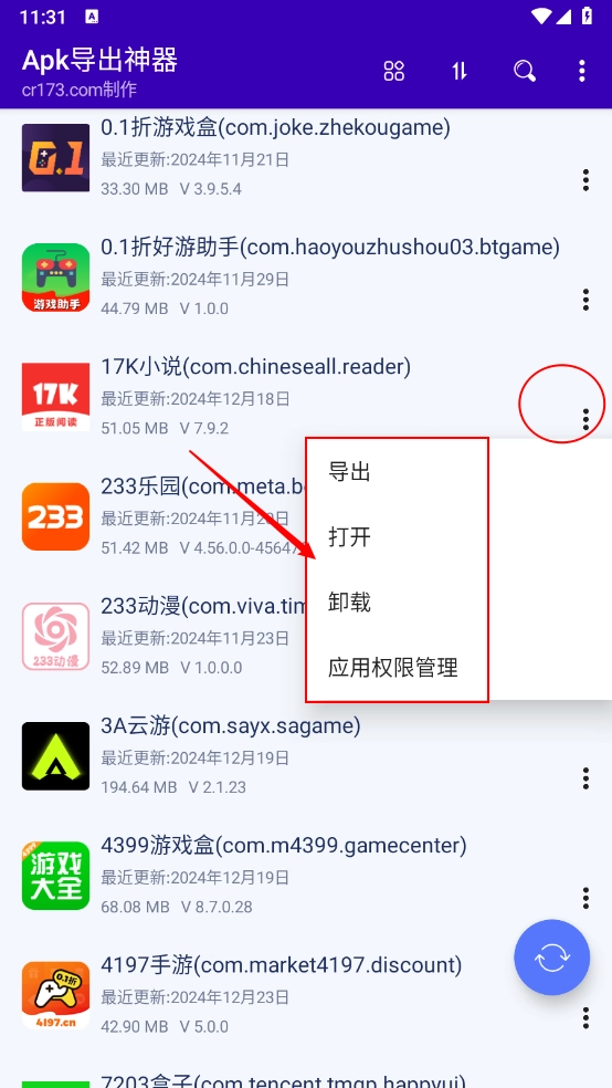 2、接着点击右侧的三个点,就像图中展示的那样,这里可以进行导入、打开、卸载等操作。