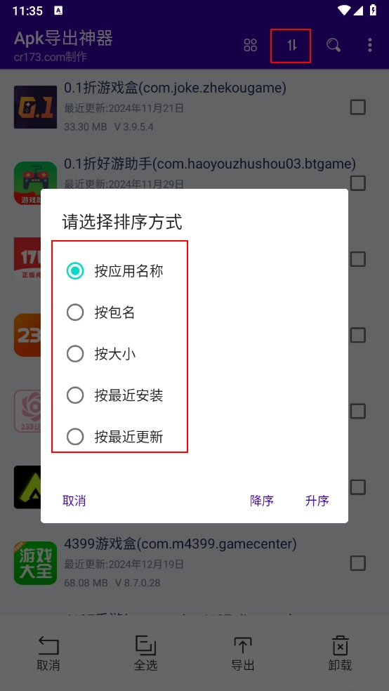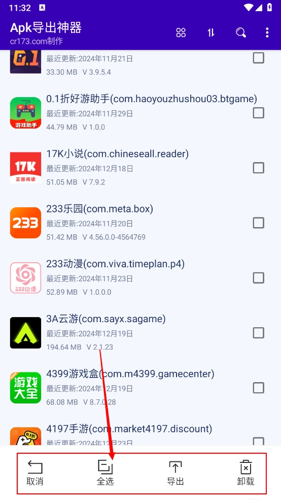 3、长按任意软件图标,就能对软件进行全选或部分选择操作,进而完成批量卸载与导出。