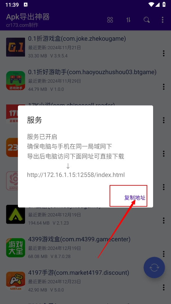 3、服务会自动开启,只需确保电脑和手机处于同一局域网,导出完成后电脑直接访问下方网址即可。