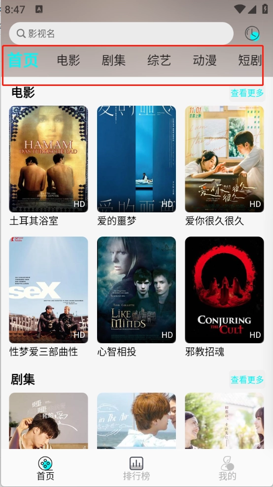 首页顶部栏涵盖了丰富的影视类型,包括电影、剧集、动漫、综艺等多种类别。