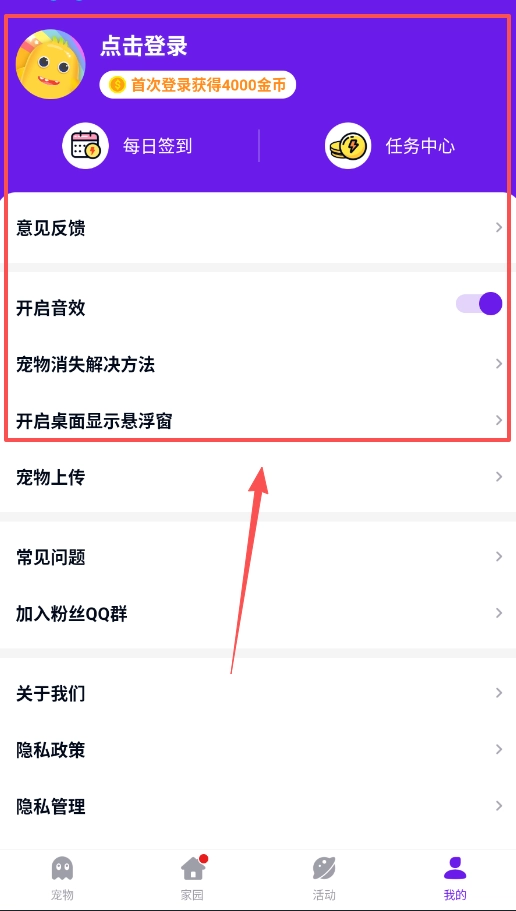 一、打开软件后,先点击右下角的“我的”。在这里,你可以完成登录操作,还能每日签到领取金币,也可以在任务中心做任务获取奖励,像宠物消失这类问题也能在这里得到解决哦。
