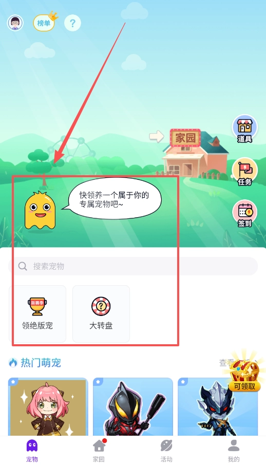 二、若有领养宠物的需求,可切换至宠物页面。在这里,你既可以直接搜索心仪的宠物,也能尝试领取绝版宠物、参与大转盘活动碰运气,各类热门萌宠都在这儿等待与你相伴。
