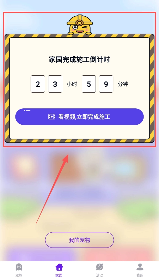 四、家园页面支持建造专属小屋,若想快速完成建造,可通过观看视频实现立即完工;小屋建成后,就能为你领养的宠物提供舒适的安置空间了。