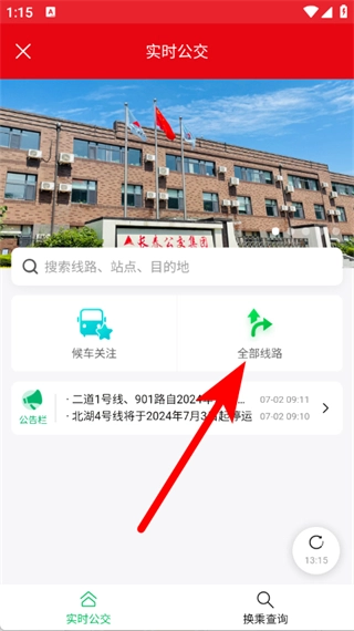 在实时公交页面,点击“全部线路”选项,即可进入线路列表页面。