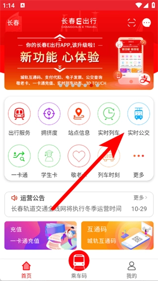 1、启动长春E出行应用,在首页找到并点击“实时公交”选项,即可进入实时公交页面。