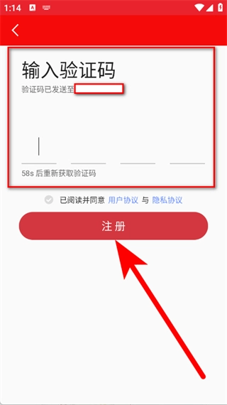 4、输入收到的短信验证码,点击注册按钮,完成账号登录。