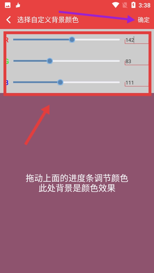 4、进入自定义背景颜色页面后,可拖动R、G、B进度条来调节颜色,待设置完成,点击【确定】按钮,即可完成背景颜色的自定义设置。