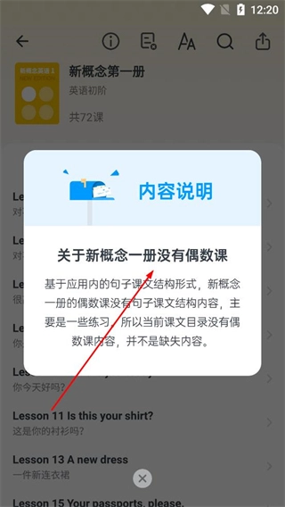 3、在课程页面查看内容说明,了解新概念一册没有偶数课的原因,明确课程内容的设置情况。