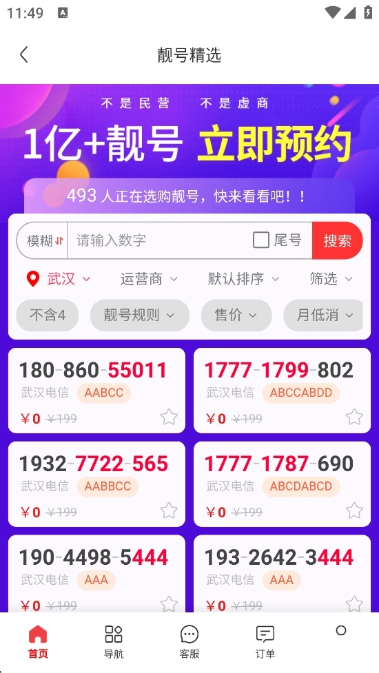 靓号专区:生日号、精品连号、炸弹号,各种靓号应有尽有;