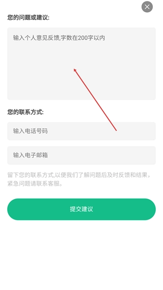 4、在意见反馈页,输入问题建议与联系方式,完成后点击【提交建议】即可反馈。