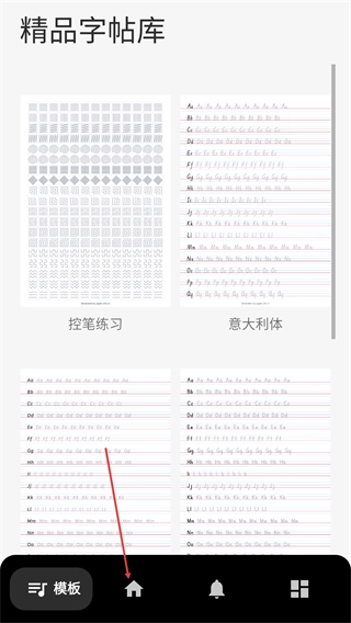 1、在【模版】页面中,点击底部【字帖】。
