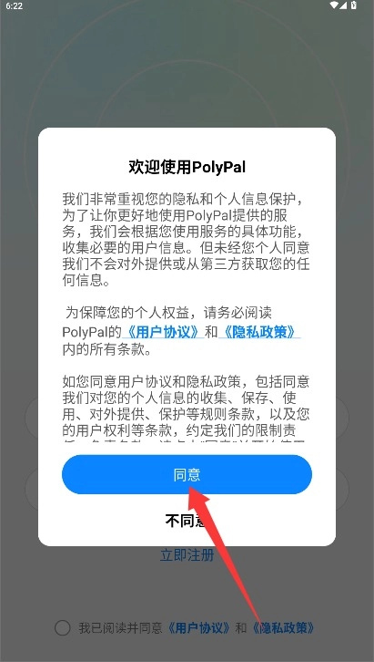 1、初次使用需阅读平台服务条款与隐私政策,确认后点击同意选项进入登录界面。