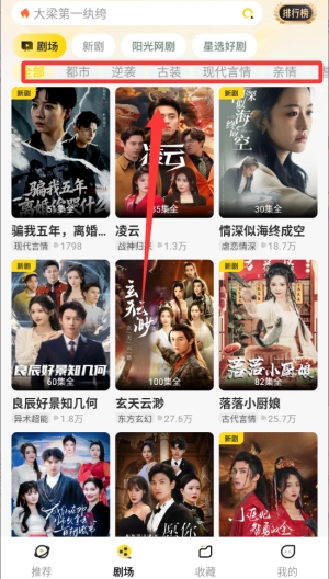 2、浏览分类剧目,平台将短剧按免费、热播、新剧等维度分类,并进一步根据题材类型进行细致划分。
