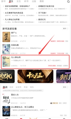 3、在书城页,点击被框选的凡人修仙传封面。