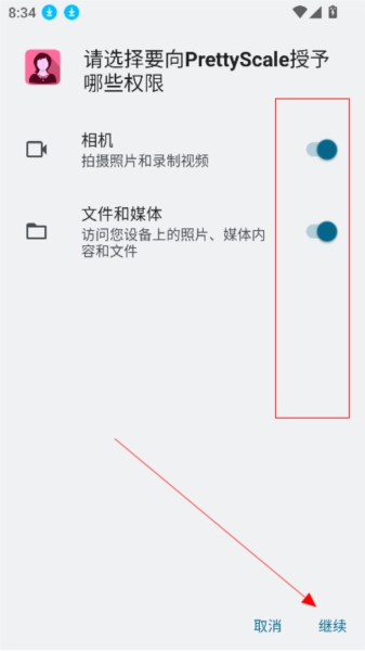 1.安装prettyscale应用,勾选授权相关选项,点击继续按钮进入下一步操作。