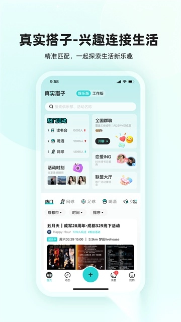 1. 热门活动推荐:首页会实时更新同城的热门活动,用户能够直接报名参加自己感兴趣的项目;