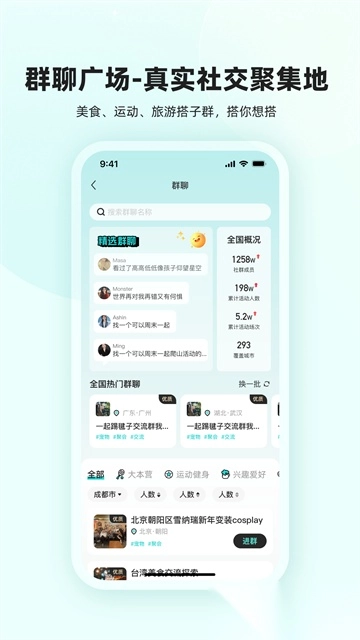 4. 群聊互动空间:设有多元兴趣群组,便于用户参与讨论或发起活动邀约;