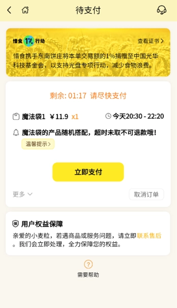 第一次使用就成功抢到了心仪面包店的魔法袋,花25块钱就拿到了原价60多元的面包,不仅省了钱,还为环保贡献了一份力量,真是特别有意义!