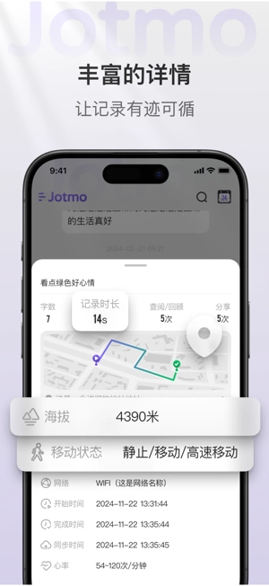 3、创新的记录时长统计功能,能帮助用户清晰掌握自身的思考历程;而位置可视化功能则可强化记忆关联,使得每一条记录都能找到对应的线索。