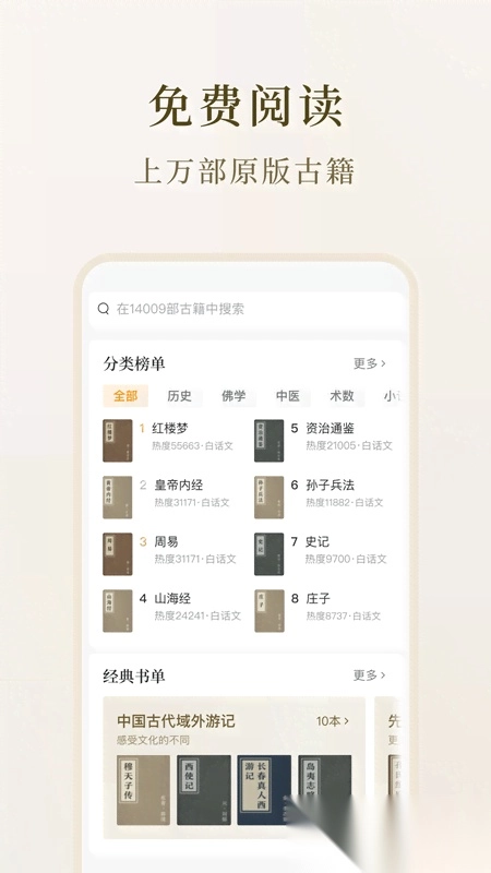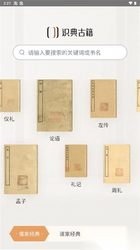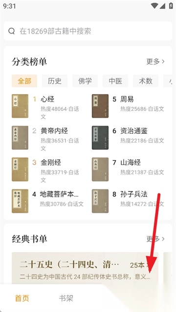 1. 首页采用四部分类法来呈现典籍,用户能够直接点击典籍封面开启阅读。
