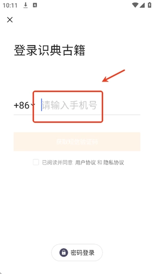 1.打开识典古籍应用,随后输入手机号码并获取验证码,完成注册与登录操作。