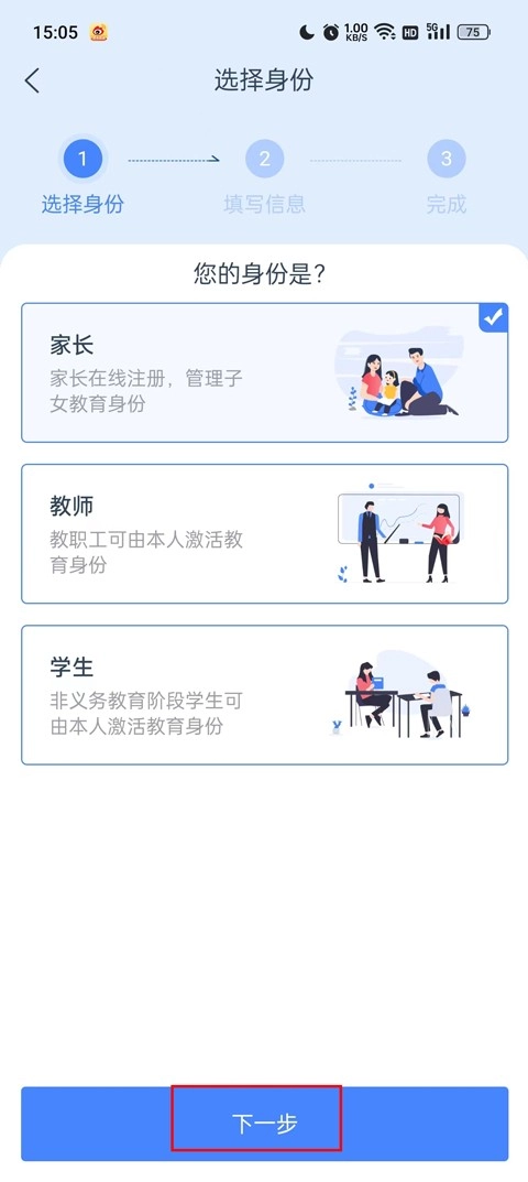 接下来,请从提供的选项里选定你要使用的注册身份,勾选对应的身份选项后,点击界面上的“下一步”按钮继续操作。