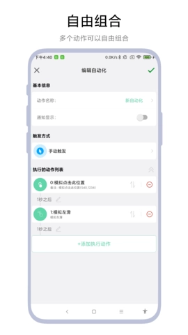 用户借助该工具能够便捷地创建各类自动化任务,像点击指定位置、滑动屏幕、点击特定文字、返回主屏幕、调节屏幕亮度等操作都能实现。用户可依据自身实际需求,把这些操作整合为一套完整的自动化流程,从而在有需要的时候能快速启动使用。