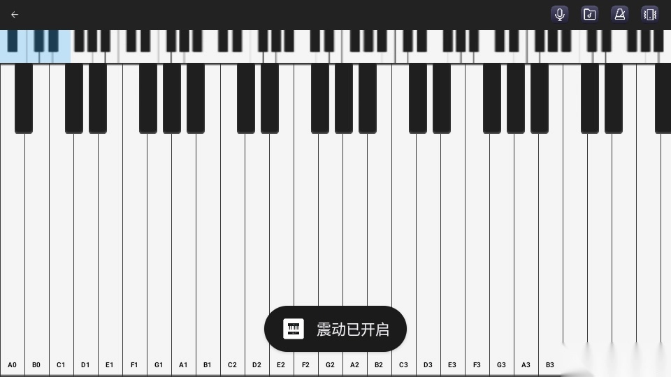 之后进入钢琴模拟弹奏界面,找到右上角形似“震动”的按钮,点击该按钮即可完成开启操作。