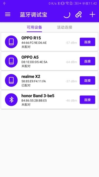 蓝牙调试宝具备多样化的搜索结果过滤功能,可依据设备名称、MAC地址、信号强度、收藏状态等条件精准筛选。它还支持多设备同时连接,提供循环搜索设置与UUID自动确认功能。对于搜索到的设备信息,如信号强度、MAC地址、配对情况等,能实时清晰展示。另外,该应用也支持通过扫描包含设备MAC地址的二维码来实现快速连接。