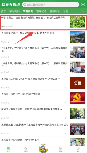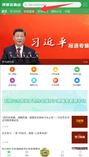 1、打开我爱五指山后,在首页顶部的导航栏里找到绿色的“本地要闻”标识,点击该标识就能进入区域热点资讯专区。