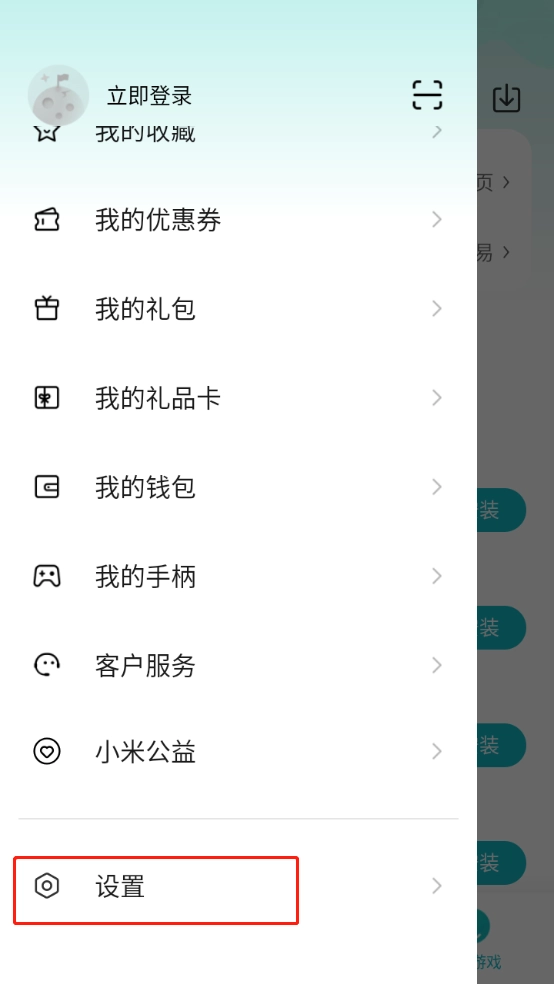 1、打开小米游戏中心,进入“我的”页面后,点击【设置】按钮。