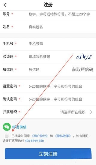 2. 当进入注册页面,依据提示填写对应信息,填完后勾选相关协议,再点击“立即注册”,如此便完成注册流程。