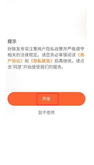 当首次打开《好豚友》应用时,系统会自动弹出用户协议的提示窗口,只需点击“同意”按钮,就能顺利进入应用的主界面了。